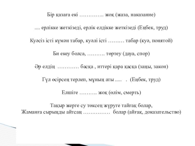 Бір қазаға екі ………….. жоқ (жаза, наказание).... ерлікке жеткізеді, ерлік елдікке жеткізеді (Еңбек, труд)Куәсіз істі күмән табар,