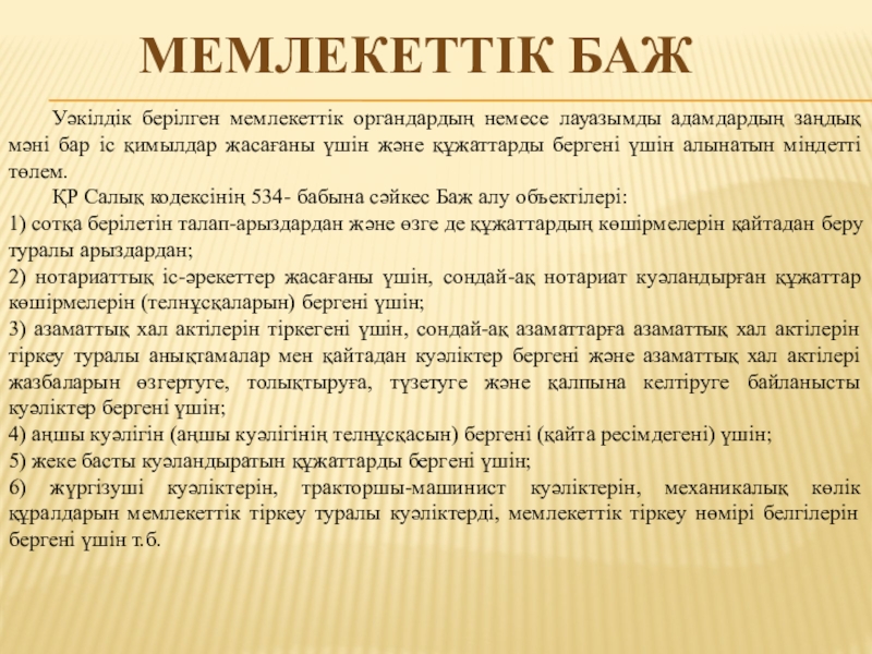 ҚР Салық кодексінің 534- бабына сәйкес Баж алу объектiлерi:
