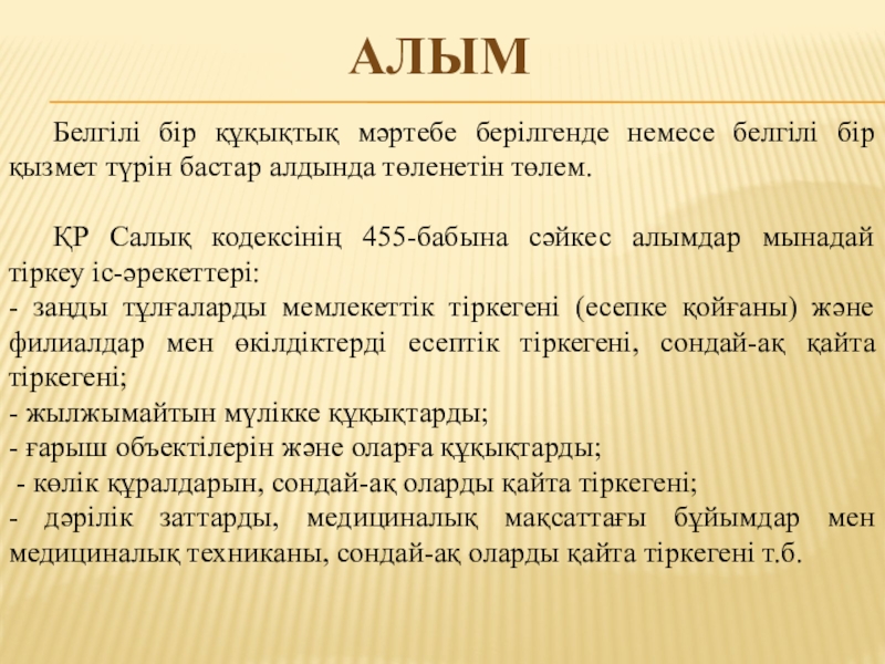 ҚР Салық кодексінің 455-бабына сәйкес алымдар мынадай тіркеу іс-әрекеттері: