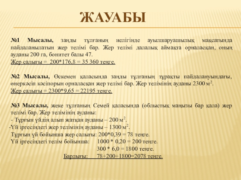 №3 Мысалы, жеке тұлғаның Семей қаласында (облыстық маңызы бар қала) жер телімі бар. Жер телімінің ауданы: