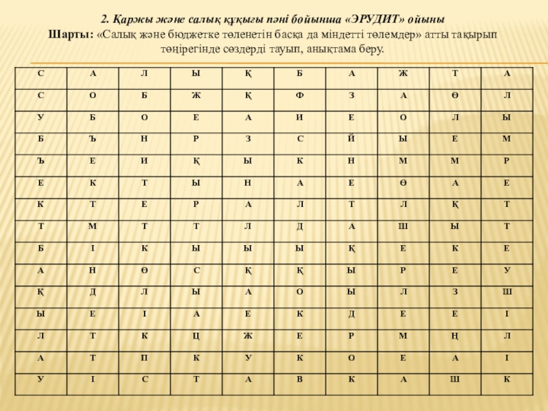 Слайд 182. Қаржы және салық құқығы пәні бойынша «ЭРУДИТ» ойыны