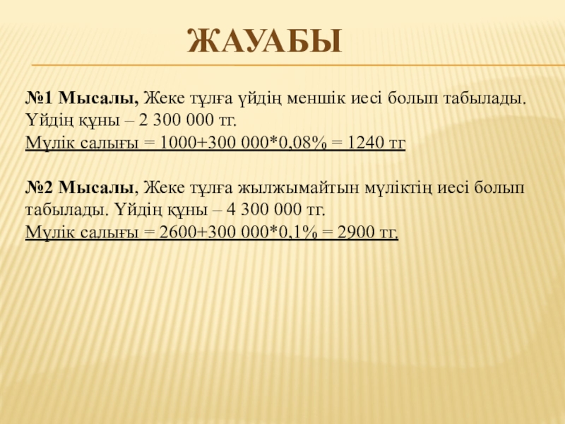 №2 Мысалы, Жеке тұлға жылжымайтын мүліктің иесі болып табылады. Үйдің құны 4 300 000 тг.
