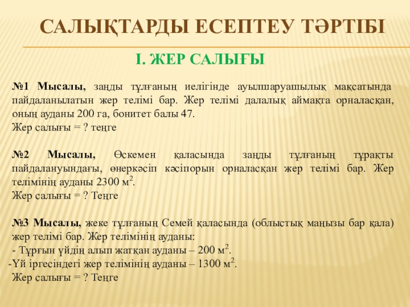 №1 Мысалы, заңды тұлғаның иелігінде ауылшаруашылық мақсатында пайдаланылатын жер телімі бар.