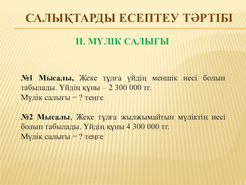 №2 Мысалы, Жеке тұлға жылжымайтын мүліктің иесі болып табылады. Үйдің құны – 4 300 000 тг.