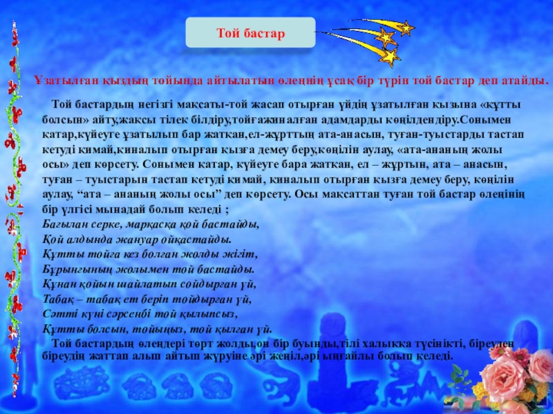 Той бастардың негізгі мақсаты-той жасап отырған үйдің ұзатылған қызына «құтты болсын» айту,жақсы тілек білдіру,тойғажиналған адамдарды көңілдендіру.Сонымен қатар,күйеуге ұзатылып бар жатқан,ел-жұрттың ата-анасын, туған-туыстарды тастап кетуді қимай,қиналып отырған қызға демеу беру,көңілін аулау, «ата-ананың жолы осы» деп көрсету. Сонымен қатар, күйеуге бара жатқан, ел – жұртын, ата – анасын, туған – туыстарын тастап кетуді қимай, қиналып отырған қызға демеу беру, көңілін аулау, “ата – ананың жолы осы” деп көрсету. Осы мақсаттан туған той бастар өлеңінің бір үлгісі мынадай болып келеді ;