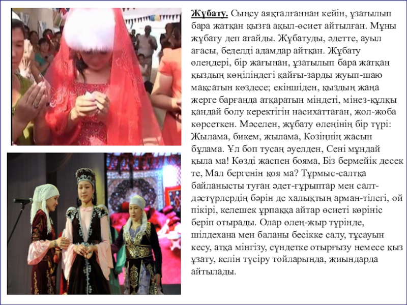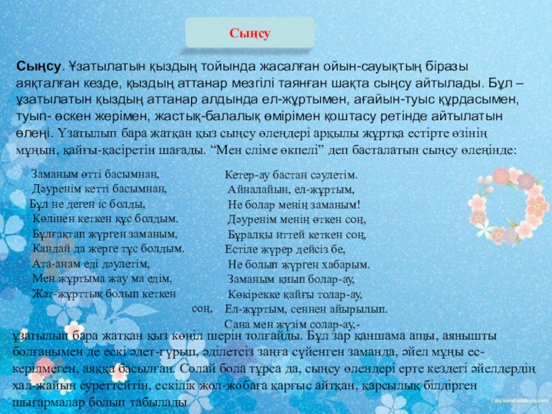 ұзатылып бара жатқан қыз көңіл шерін толғайды. Бұл зар қаншама ащы, аянышты болғанымен де ескі әдет-гүрып, әділетсіз заңға сүйенген заманда, әйел мұңы ес-керілмеген, аяққа басылған. Солай бола тұрса да, сыңсу өлендері ерте кездегі әйелдердің хал-жайын суреттсйтін, ескілік жол-жобаға қарғыс айтқан, қарсылық білдірген шығармалар болып табылады