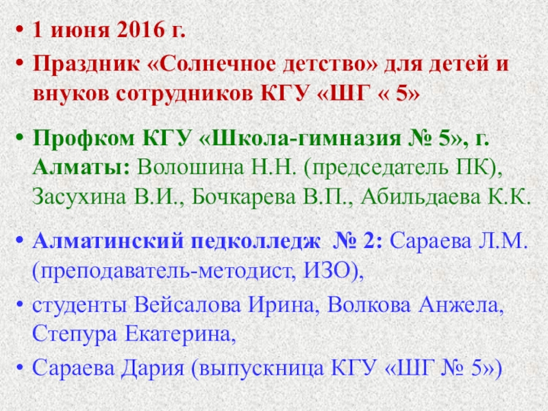 Презентация, доклад на тему Слайды 1, 25-32. Праздник для детей и внуков сотрудников КГУ “ШГ № 5 г.Алматы “Солнечное детство”. Профком школы. Флеш-моб, загадки и песни и т.п.