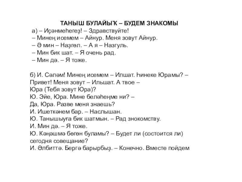 б) И. Сəлəм! Минең исемем – Илшат. Һинеке Юрамы? – Привет! Меня зовут – Ильшат. А твое –