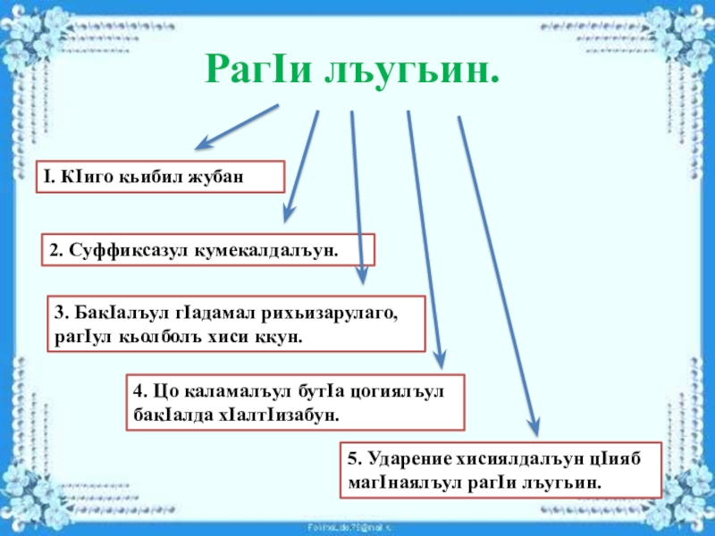 5. Ударение хисиялдалъун цIияб магIнаялъул рагIи лъугьин.