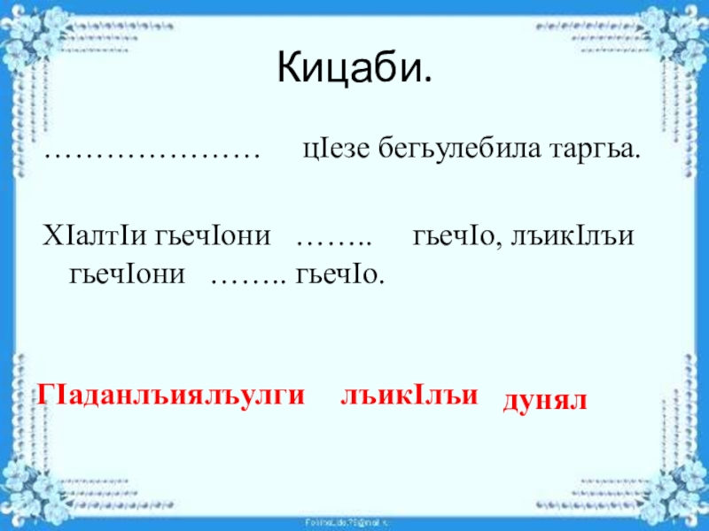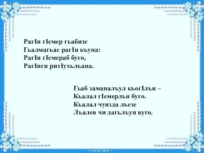 ЛЪИМАЛ ПИКРУ ГЬАБИЗЕ РУГЬУН ГЬАРИ. КВЕШАБ ЛЪИКIАБ БАТIА ГЬАБИЗЕ РУГЬУН ГЬАРИ. ЛЪИКI ЦIАЛИЯЛДЕ ГЪИРА БАЗАБИ.