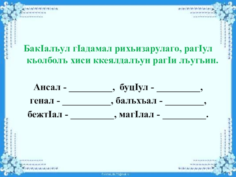БАКIАЛЪУЛ ГIАДАМАЛ РИХЬИЗАРУЛАГО, КЬОЛБОЛЪ ХИСИ ККЕЯЛДАЛЪУН, ЦIИЯЛ РАГIАБИ ЛЪУГЬИН ЛЪИМАЛАЗЕ БАЯН ГЬАБИ. СЛОВАРАЛГУН ХIАЛТIИЗЕ ЦIАЛДОХЪАБИ РУГЬУН ГЬАРИ.