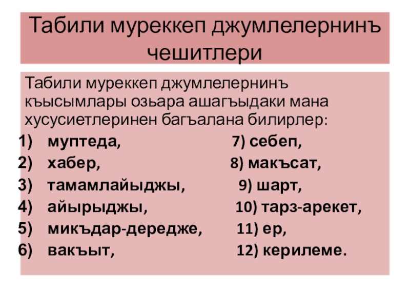 Слайд 4Табили муреккеп джумлелернинъ чешитлери