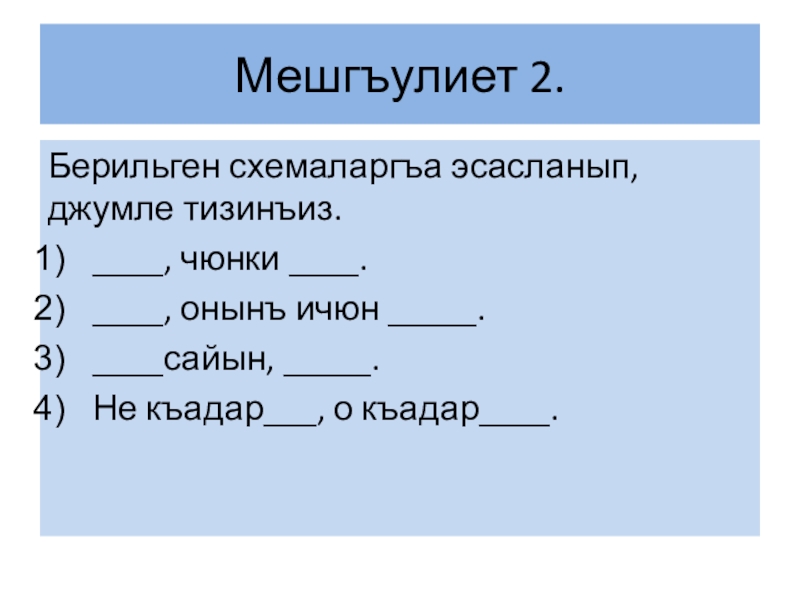 Мешгъулиет 2.Берильген схемаларгъа эсасланып, джумле тизинъиз.____, чюнки ____.____, онынъ ичюн _____.____сайын, _____.Не къадар___, о къадар____.