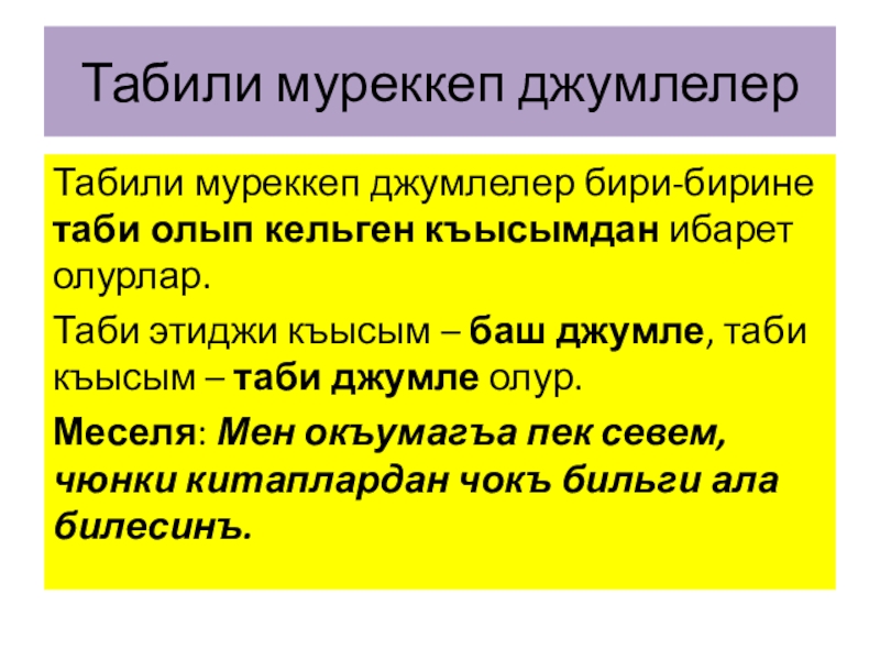 Табили муреккеп джумлелерТабили муреккеп джумлелер бири-бирине таби олып кельген къысымдан ибарет олурлар. Таби этиджи къысым – баш джумле, таби къысым – таби джумле олур.Меселя: Мен окъумагъа пек севем, чюнки китаплардан чокъ бильги ала билесинъ.