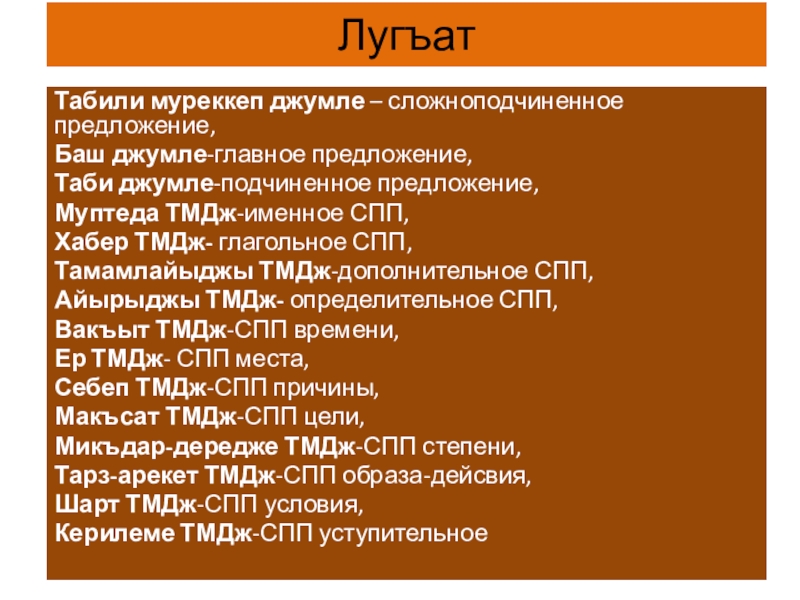ЛугъатТабили муреккеп джумле – сложноподчиненное предложение,Баш джумле-главное предложение,Таби джумле-подчиненное предложение,Муптеда ТМДж-именное СПП,Хабер ТМДж- глагольное СПП,Тамамлайыджы ТМДж-дополнительное СПП,Айырыджы