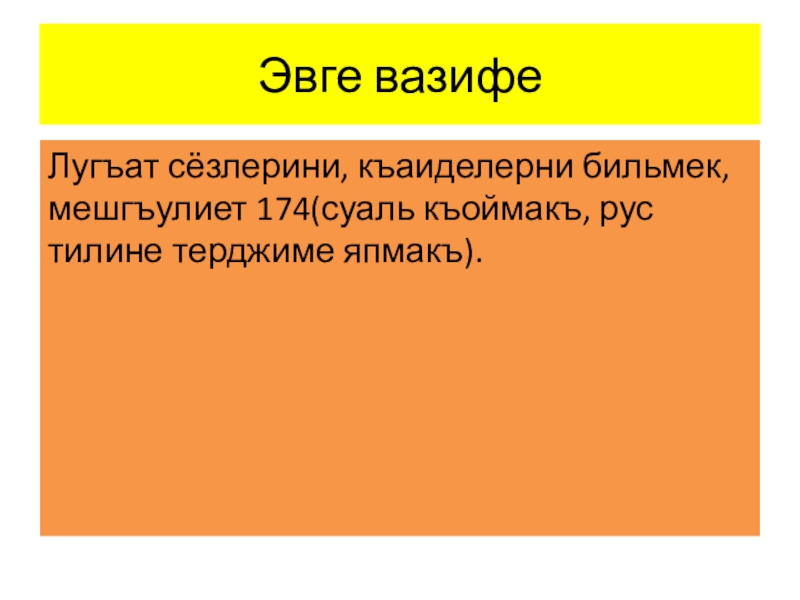 Эвге вазифеЛугъат сёзлерини, къаиделерни бильмек, мешгъулиет 174(суаль къоймакъ, рус тилине терджиме япмакъ).