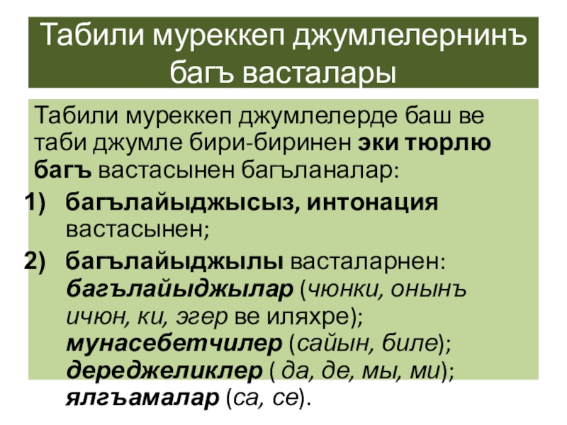 Табили муреккеп джумлелернинъ багъ васталарыТабили муреккеп джумлелерде баш ве таби джумле бири-биринен эки тюрлю багъ вастасынен багъланалар:багълайыджысыз,