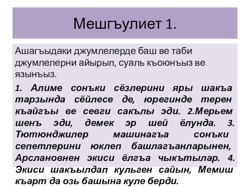 Мешгъулиет 1.Ашагъыдаки джумлелерде баш ве таби джумлелерни айырып, суаль къоюнъыз ве язынъыз.1. Алиме сонъки сёзлерини яры шакъа