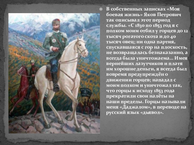 В собственных записках «Моя боевая жизнь» Яков Петрович так описывал этот период службы. «С 1830 по 1853