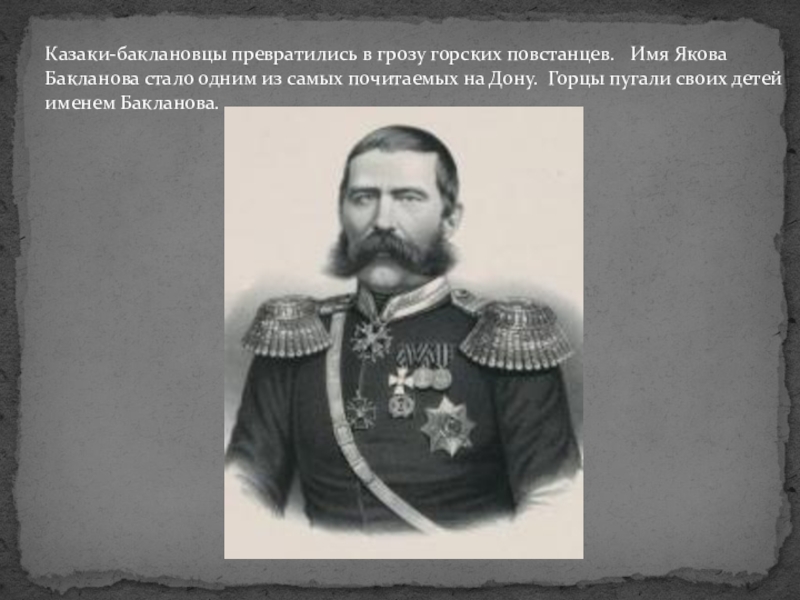 Слайд 8Казаки-баклановцы превратились в грозу горских повстанцев. Имя Якова Бакланова стало