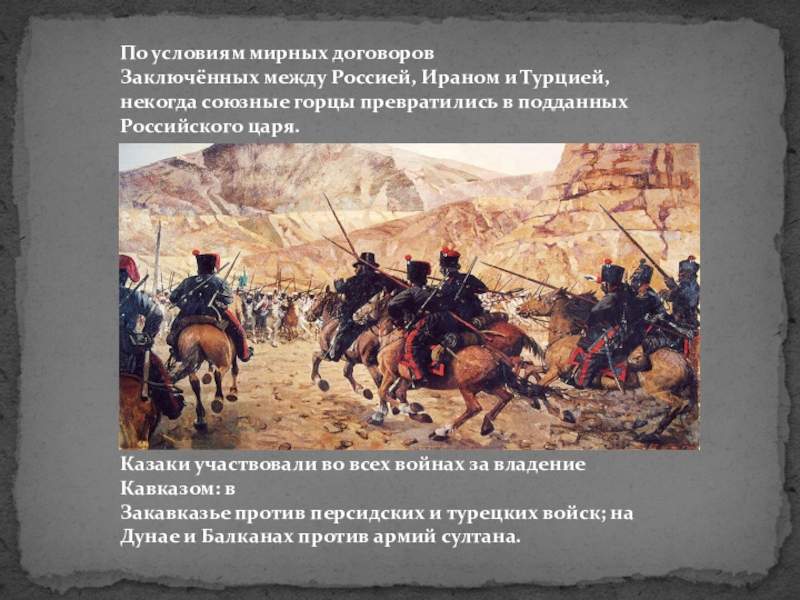 По условиям мирных договоров Заключённых между Россией, Ираном и Турцией, некогда союзные горцы превратились в подданных Российского