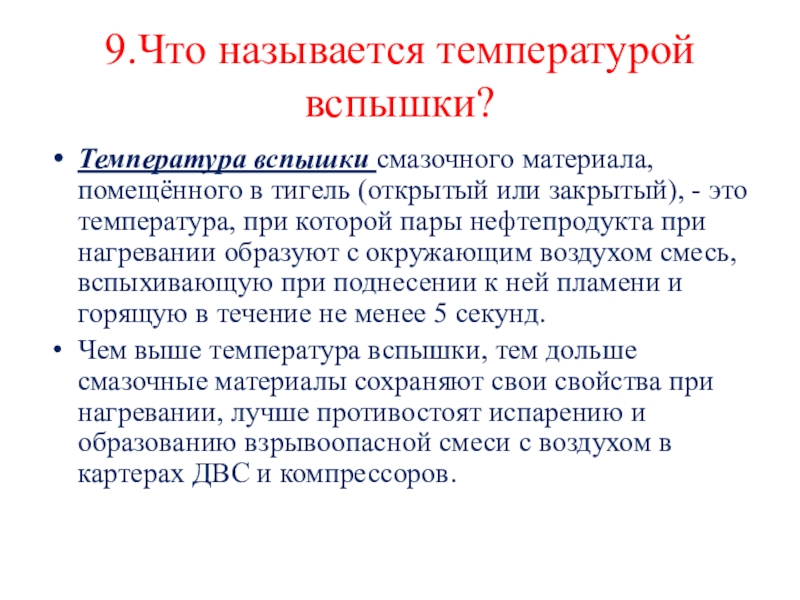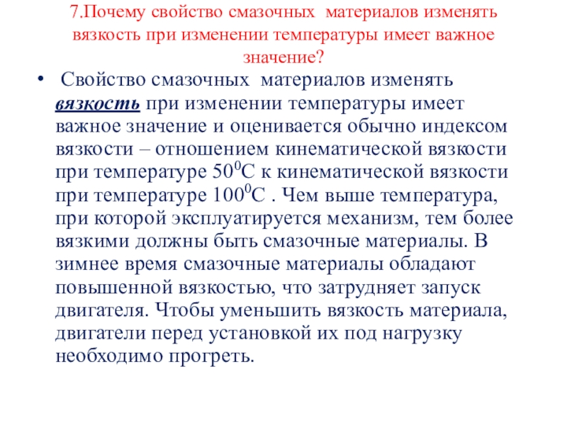 Свойство смазочных материалов изменять вязкость при изменении температуры имеет важное значение и оценивается обычно индексом вязкости – отношением кинематической вязкости при температуре 500С к кинематической вязкости при температуре 1000С . Чем выше температура, при которой эксплуатируется механизм, тем более вязкими должны быть смазочные материалы. В зимнее время смазочные материалы обладают повышенной вязкостью, что затрудняет запуск двигателя. Чтобы уменьшить вязкость материала, двигатели перед установкой их под нагрузку необходимо прогреть.