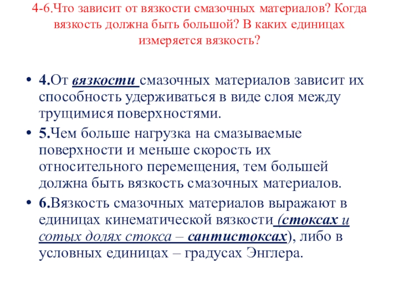 4.От вязкости смазочных материалов зависит их способность удерживаться в виде слоя между трущимися поверхностями.