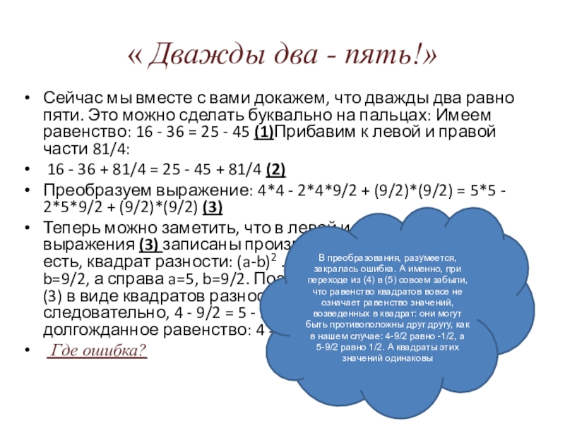 В преобразования, разумеется, закралась ошибка. А именно, при переходе из (4) в (5) совсем забыли, что равенство квадратов вовсе не означает равенство значений, возведенных в квадрат: они могут быть противоположны друг другу, как в нашем случае: 4-9/2 равно -1/2, а 5-9/2 равно 1/2. А квадраты этих значений одинаковы