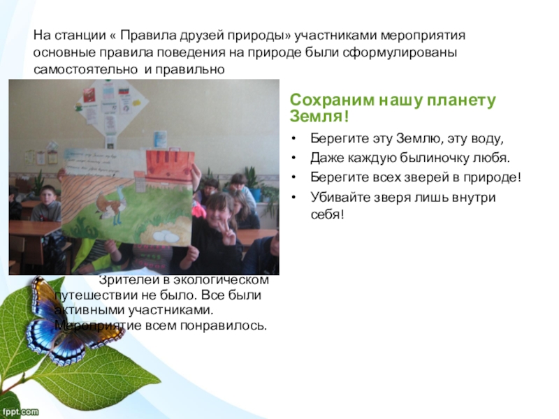 Зрителей в экологическом путешествии не было. Все были активными участниками. Мероприятие всем понравилось.
