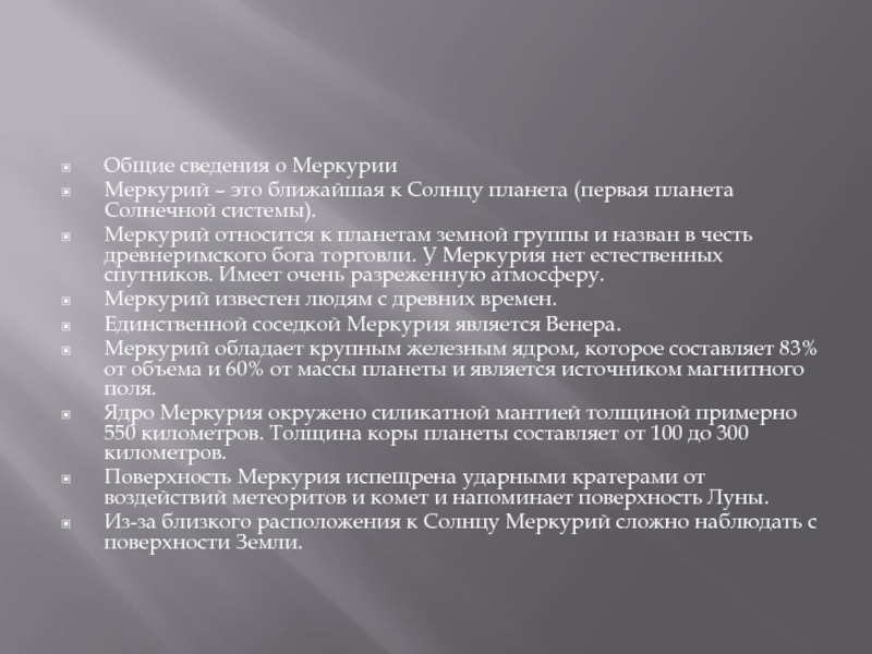 Меркурий относится к планетам земной группы и назван в честь древнеримского бога торговли. У Меркурия нет естественных спутников. Имеет очень разреженную атмосферу.