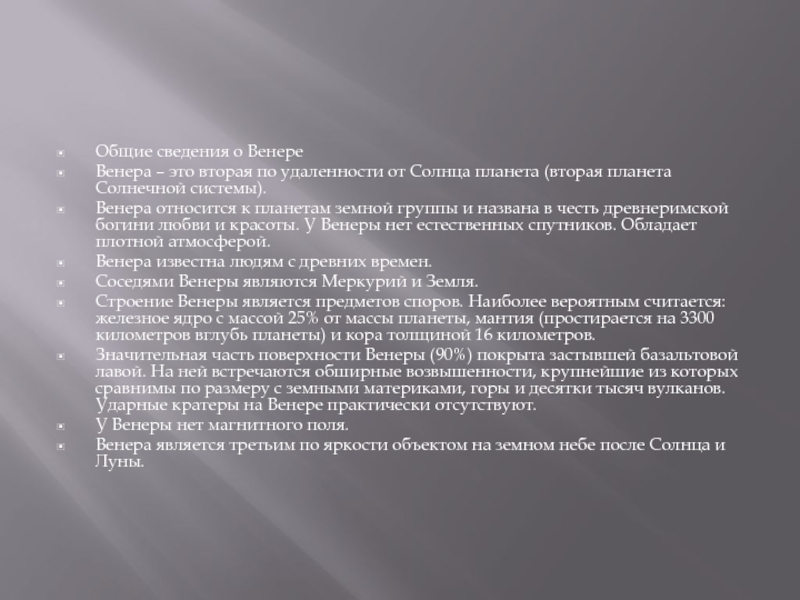 Венера относится к планетам земной группы и названа в честь древнеримской богини любви и красоты. У Венеры нет естественных спутников. Обладает плотной атмосферой.