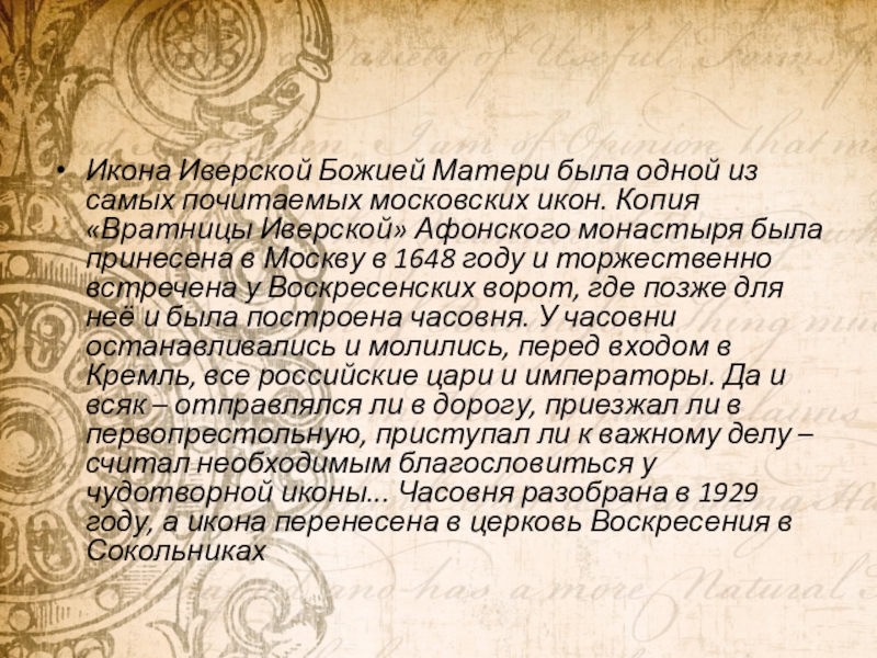 Слайд 8Икона Иверской Божией Матери была одной из самых почитаемых московских икон.