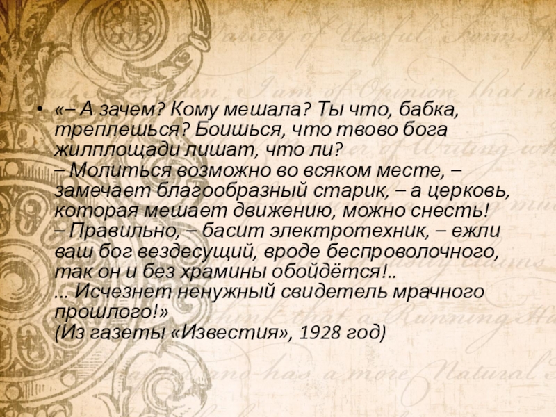 – Молиться возможно во всяком месте, – замечает благообразный старик, – а церковь, которая мешает движению, можно снесть!