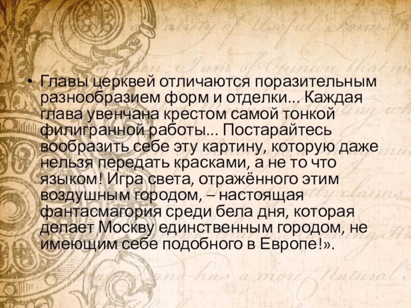крестом самой тонкой филигранной работы... Постарайтесь вообразить себе эту картину, которую даже нельзя передать красками, а не то что языком! Игра света, отражённого этим воздушным городом, – настоящая фантасмагория среди бела дня, которая делает Москву единственным городом, не имеющим себе подобного в Европе!».