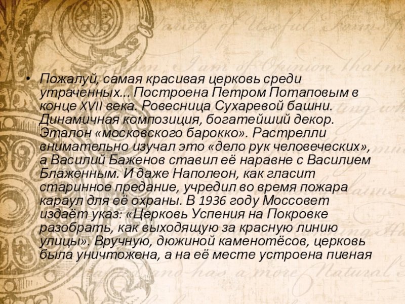 Слайд 12Пожалуй, самая красивая церковь среди утраченных... Построена Петром Потаповым в конце