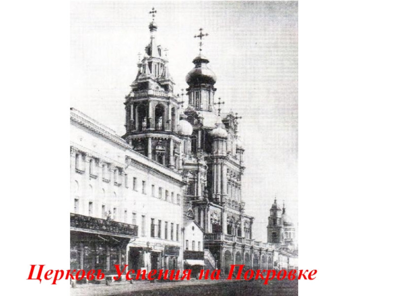XVII века. Ровесница Сухаревой башни. Динамичная композиция, богатейший декор. Эталон «московского барокко». Растрелли внимательно изучал это «дело рук человеческих», а Василий Баженов ставил её наравне с Василием Блаженным. И даже Наполеон, как гласит старинное предание, учредил во время пожара караул для её охраны. В 1936 году Моссовет издаёт указ: «Церковь Успения на Покровке разобрать, как выходящую за красную линию улицы». Вручную, дюжиной каменотёсов, церковь была уничтожена, а на её месте устроена пивная