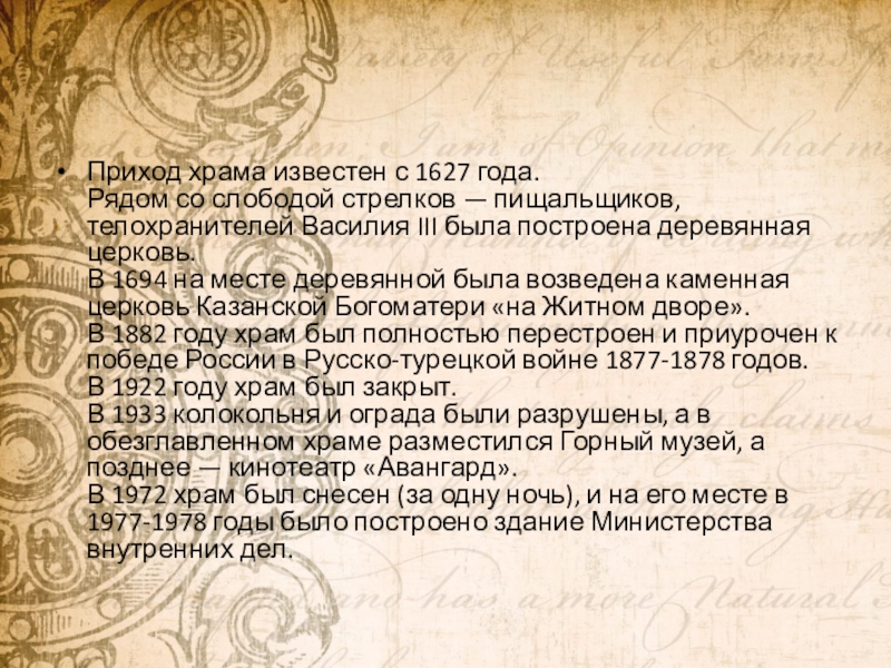 В 1694 на месте деревянной была возведена каменная церковь Казанской Богоматери «на Житном дворе».