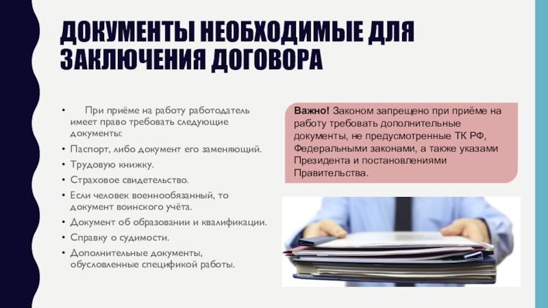 Важно! Законом запрещено при приёме на работу требовать дополнительные документы, не предусмотренные ТК РФ, Федеральными законами, а также указами Президента и постановлениями Правительства.