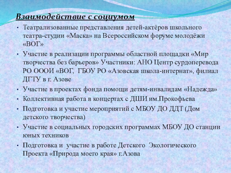 Участие в реализации программы областной площадки «Мир творчества без барьеров» Участники: АНО Центр сурдоперевода РО ОООИ «ВОГ, ГБОУ РО «Азовская школа-интернат», филиал ДГТУ в г. Азове