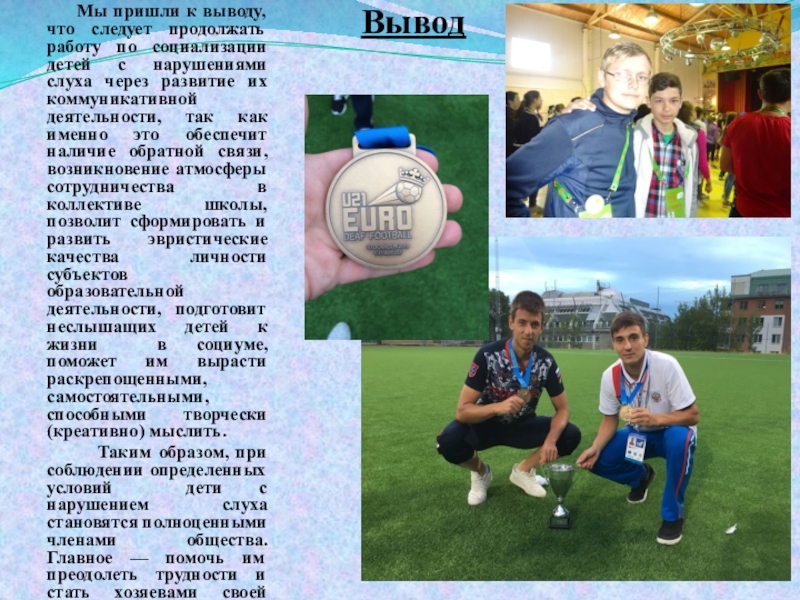 Таким образом, при соблюдении определенных условий дети с нарушением слуха становятся полноценными членами общества. Главное — помочь им преодолеть трудности и стать хозяевами своей судьбы.
