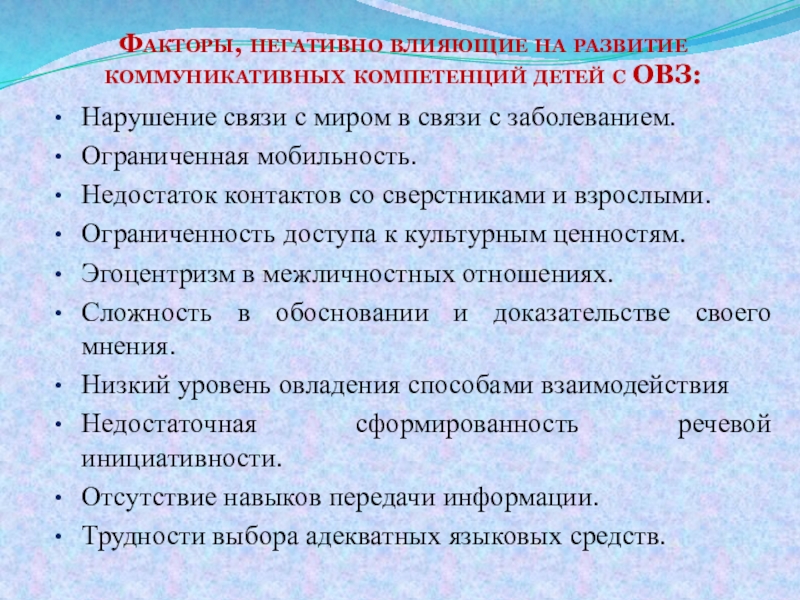 Слайд 16Факторы, негативно влияющие на развитие коммуникативных компетенций детей с ОВЗ: