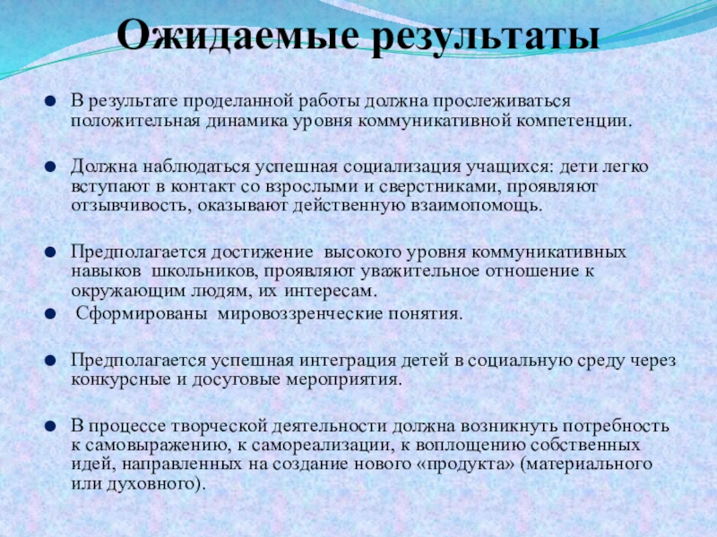 Предполагается достижение высокого уровня коммуникативных навыков школьников, проявляют уважительное отношение к окружающим людям, их интересам.