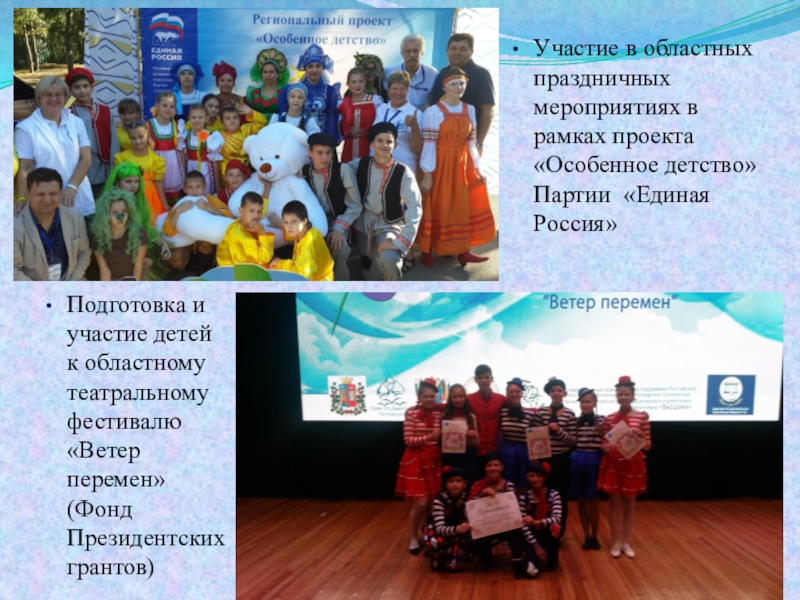 Слайд 22Участие в областных праздничных мероприятиях в рамках проекта «Особенное детство» Партии