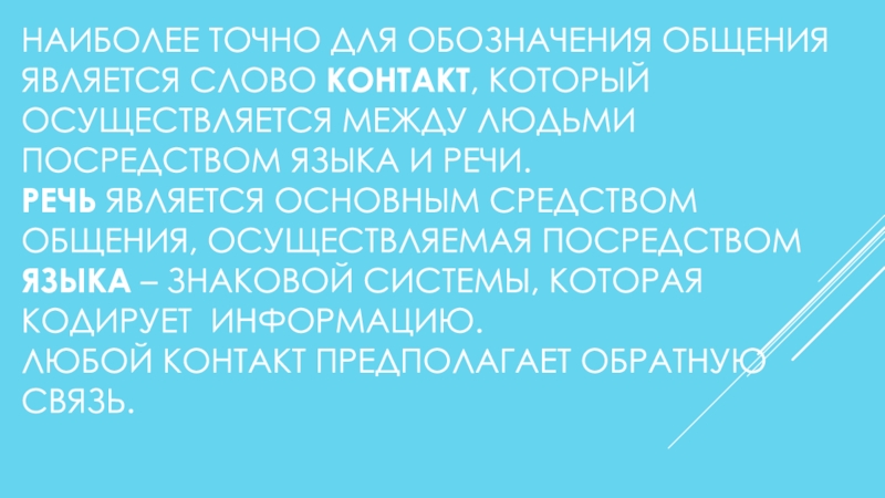 НАИБОЛЕЕ ТОЧНО ДЛЯ ОБОЗНАЧЕНИЯ ОБЩЕНИЯ ЯВЛЯЕТСЯ СЛОВО КОНТАКТ, КОТОРЫЙ ОСУЩЕСТВЛЯЕТСЯ МЕЖДУ ЛЮДЬМИ ПОСРЕДСТВОМ ЯЗЫКА И РЕЧИ.