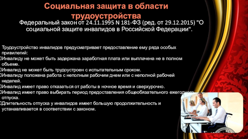 Трудоустройство инвалидов предусматривает предоставление ему ряда особых привилегий: