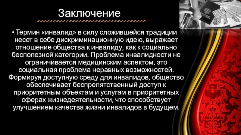 Инвали́дность происходит от латинского корня ( invalidus — букв. «несильный», in — «не» + validus — «силач») — состояние человека, при котором имеются препятствия или ограничения в деятельности человека с физическими, умственными, сенсорными или психическими отклонениями.