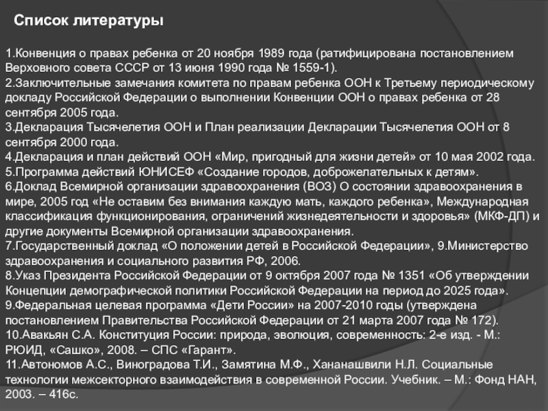 7.Государственный доклад «О положении детей в Российской Федерации», 9.Министерство здравоохранения и социального развития РФ, 2006.