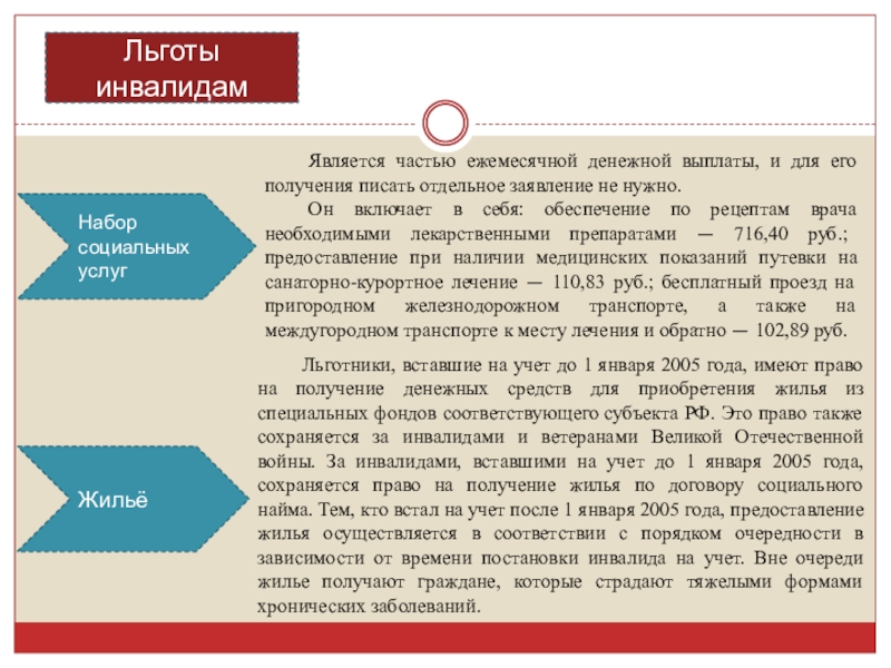Льготники, вставшие на учет до 1 января 2005 года, имеют право на получение денежных средств для приобретения жилья из специальных фондов соответствующего субъекта РФ. Это право также сохраняется за инвалидами и ветеранами Великой Отечественной войны. За инвалидами, вставшими на учет до 1 января 2005 года, сохраняется право на получение жилья по договору социального найма. Тем, кто встал на учет после 1 января 2005 года, предоставление жилья осуществляется в соответствии с порядком очередности в зависимости от времени постановки инвалида на учет. Вне очереди жилье получают граждане, которые страдают тяжелыми формами хронических заболеваний.