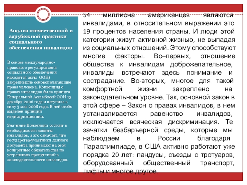 54 миллиона американцев являются инвалидами, в относительном выражении это 19 процентов населения страны. И люди этой категории живут активной жизнью, не выпадая из социальных отношений. Этому способствуют многие факторы. Во–первых, отношение общества к инвалидам доброжелательное, инвалиды встречают здесь понимание и сострадание. Во-вторых, многое для такой комфортной жизни закреплено на законодательном уровне. Так, основной закон в этой сфере – Закон о правах инвалидов, в нем устанавливается равенство инвалидов, исключается всяческая дискриминация. Те зачатки безбаръерной среды, которые мы наблюдаем в России благодаря Параолимпиаде, в США активно работают уже порядка 20 лет: пандусы, съезды с тротуаров, оборудованный общественный транспорт, лифты и многое другое.