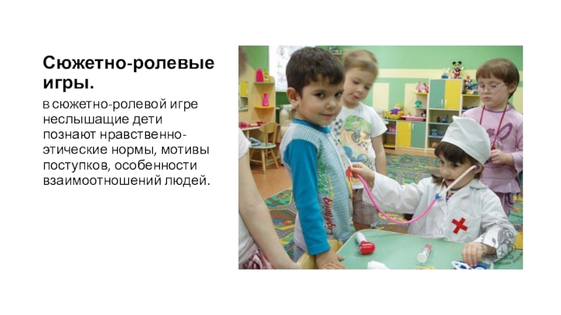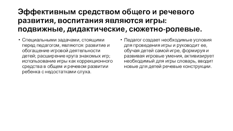Специальными задачами, стоящими перед педагогом, являются: развитие и обогащение игровой деятельности детей; расширение круга знакомых игр; использование игры как коррекционного средства в общем и речевом развитии ребенка с недостатками слуха.